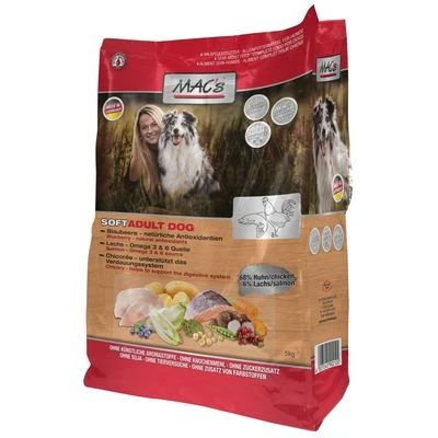 Dank dem Verzicht auf künstliche Zusätze oder Inhaltsstoffe mit allergenem Potential wie Weizen, Soja oder Milchprodukte profitieren gerade sensible Hunde von MAC’s Soft Adult Huhn. Als Kohlenhydratquellen werden Kartoffeln eingesetzt, glutenhaltiges Getreide ist in dieser Rezeptur nicht enthalten. Wertvolle Ballaststoffe und Prebiotika wie Seealgen, FOS und MOS unterstützen die hohe Verdaulichkeit dieses Futters und können die Darmgesundheit unterstützen, sowie für eine ausgewogene Darmflora sorgen. Blaubeeren liefern natürliche antioxidativ wirkende Pflanzenstoffe. Ein schonendes und aufwendiges Herstellungsverfahren ermöglicht die Verarbeitung von Frischfleisch, Vitamine und Nährstoffe bleiben dabei nahezu komplett erhalten.