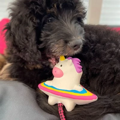 Mit diesem Spielzeug-Einhorn kommt ein Hauch Magie ins Hundekörbchen: Magic Mikey verzaubert mit seinem farbenfrohen Design und seiner freundlichen Ausstrahlung jede Fellnase im Handumdrehen und sorgt für abwechslungsreichen Spielspaß. Das Hundespielzeug von Max & Molly eignet sich perfekt zum Kauen, lädt dank seiner kuscheligen Plüsch-Rückseite aber auch zum Schmusen und Liebhaben ein. Schnappt sich Ihr Hund das Einhorn, quietscht es lustig, was zusätzlich zum Spielen und Toben animiert.