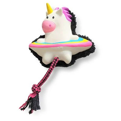 Originelles Hundespielzeug zum Kauen und Kuscheln, mit Seil zum Beißen und Zerren, buntes Einhorn-Design, kuschelige Rückseite, macht lustige Quietschgeräusche, aus Baumwolle, Latex & Polyester