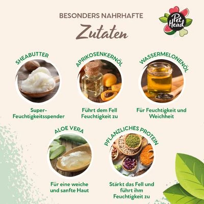 Das Spray enthält reichhaltige Sheabutter, die unter anderem Feuchtigkeit spendet und zu einer Reduzierung von Haarbruch beitragen kann. Auch das enthaltene Aprikosenkernöl pflegt intensiv und kann geschmeidiges Fell unterstützen. Zudem wird das Hunde-Haarspray mit Wassermelonenkernöl zur Unterstützung der natürlichen Talgproduktion und mit Aloe Vera hergestellt.