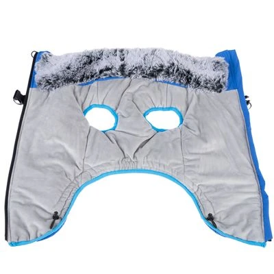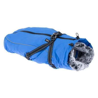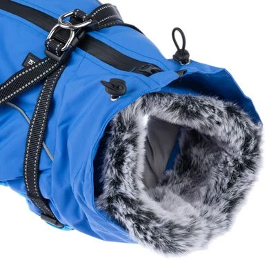 Wetterfester Wintermantel für Hunde, mit eingebautem Geschirr, wasserfestes Obermaterial, gefüttert mit Fleece, hoher Kragen aus Fell-Imitat gegen Wind & Kälte, mehrfach verstellbar, Farbe: blau